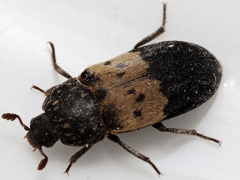 Der gemeine Speckkäfer (lat. Dermestes lardarius) ist ein Vorratsschädling und erreich eine Körperlänge von 6 bis 10 mm. Der Körper des Speckkäfers ist länglich bis oval und komplett mit Schuppen und feinen Härchen bedeckt. Der Kopf, der Halsschild und das Hinterteil sind schwarz, während die Deckflügel in der Körpermitte graugelb behaart sind und auf jeder Seite drei kleine schwarze Flecken aufweisen. Die Fühler am Kopf haben einen rötlichen Stich.